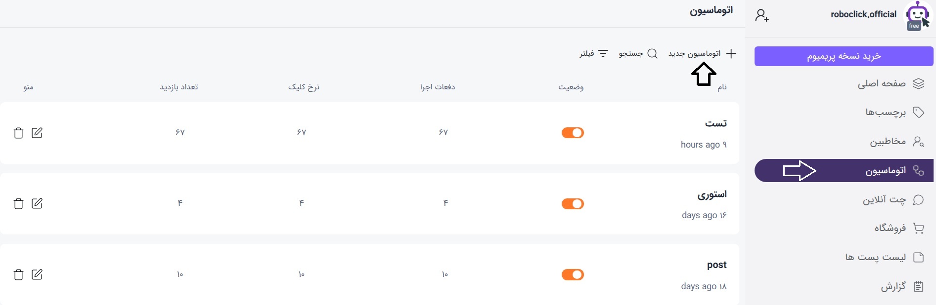 بعد از ورود به داشبورد، از منوی سمت راست روی گزینه اتوماسیون کلیک کنید. در این بخش میتوانید تمامی اتوماسیونهای فعال و غیر فعال را مشاهده کنید.