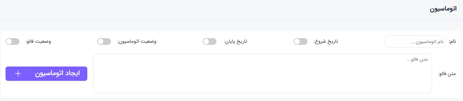 یک نام مشخص برای اتوماسیون وارد کنید تا بعداً راحتتر آن را در لیست پیدا کنید (مثلاً: «پاسخ به فالو جدید» یا «خوشآمدگویی»).تاریخ شروع و پایان: