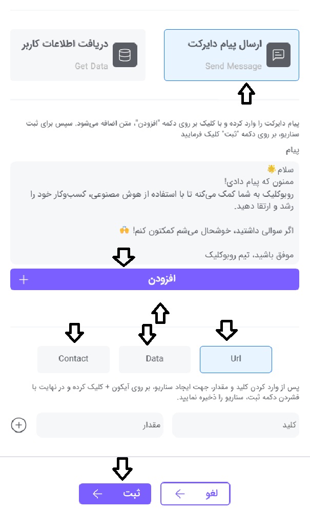 اگر میخواهید در پیام دایرکت لینک یا آدرس سایت قرار دهید، باید URL را انتخاب کنید. سپس در قسمت کلید اسم دکمه (مثلاً “بازدید سایت” یا “لینک خرید”) و در قسمت مقدار، آدرس لینک یا سایت مورد نظر را وارد کنید.Contact: